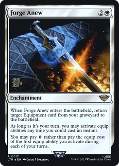 When this enchantment enters, return target Equipment card from your graveyard to the battlefield. During your turn, you may activate equip abilities any time you could cast an instant. You may pay {0} rather than pay the equip cost of the first equip ability you activate during each of your turns.