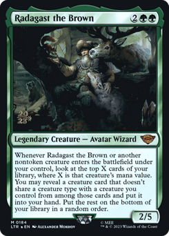 Whenever Radagast or another nontoken creature you control enters, look at the top X cards of your library, where X is that creature's mana value. You may reveal a creature card that doesn't share a creature type with a creature you control from among those cards and put it into your hand. Put the rest on the bottom of your library in a random order.