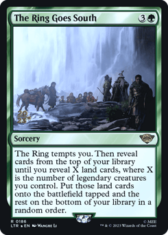 The Ring tempts you. Then reveal cards from the top of your library until you reveal X land cards, where X is the number of legendary creatures you control. Put those land cards onto the battlefield tapped and the rest on the bottom of your library in a random order.