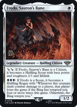 {W/B}{W/B}: If Frodo is a Citizen, it becomes a Halfling Scout with base power and toughness 2/3 and lifelink. {B}{B}{B}: If Frodo is a Scout, it becomes a Halfling Rogue with "Whenever this creature deals combat damage to a player, that player loses the game if the Ring has tempted you four or more times this game. Otherwise, the Ring tempts you."