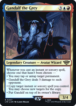 Whenever you cast an instant or sorcery spell, choose one that hasn't been chosen — • You may tap or untap target permanent. • Gandalf deals 3 damage to each opponent. • Copy target instant or sorcery spell you control. You may choose new targets for the copy. • Put Gandalf on top of its owner's library.