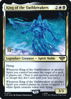 Flying Whenever King of the Oathbreakers or another Spirit you control becomes the target of a spell, it phases out. (Treat it and anything attached to it as though they don't exist until your next turn.) Whenever King of the Oathbreakers or another Spirit you control phases in, create a tapped 1/1 white Spirit creature token with flying.