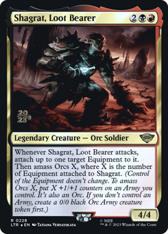 Whenever Shagrat attacks, attach up to one target Equipment to it. Then amass Orcs X, where X is the number of Equipment attached to Shagrat. (Control of the Equipment doesn't change. To amass Orcs X, put X +1/+1 counters on an Army you control. It's also an Orc. If you don't control an Army, create a 0/0 black Orc Army creature token first.)