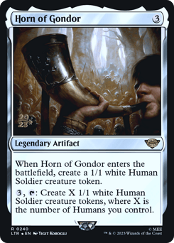 When Horn of Gondor enters, create a 1/1 white Human Soldier creature token. {3}, {T}: Create X 1/1 white Human Soldier creature tokens, where X is the number of Humans you control.
