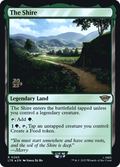 The Shire enters tapped unless you control a legendary creature. {T}: Add {G}. {1}{G}, {T}, Tap an untapped creature you control: Create a Food token.