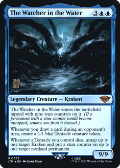 The Watcher in the Water enters tapped with nine stun counters on it. (If a permanent with a stun counter would become untapped, remove one from it instead.) Whenever you draw a card during an opponent's turn, create a 1/1 blue Tentacle creature token. Whenever a Tentacle you control dies, untap up to one target Kraken and put a stun counter on up to one target nonland permanent.
