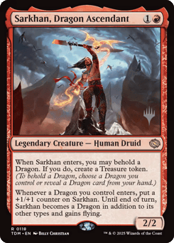 When Sarkhan enters, you may behold a Dragon. If you do, create a Treasure token. (To behold a Dragon, choose a Dragon you control or reveal a Dragon card from your hand.) Whenever a Dragon you control enters, put a +1/+1 counter on Sarkhan. Until end of turn, Sarkhan becomes a Dragon in addition to its other types and gains flying.