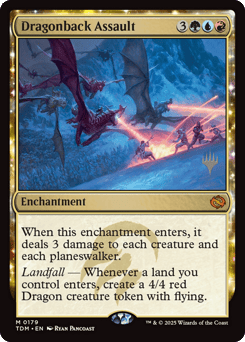 When this enchantment enters, it deals 3 damage to each creature and each planeswalker. Landfall — Whenever a land you control enters, create a 4/4 red Dragon creature token with flying.