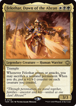 Trample Whenever Felothar enters or attacks, you may sacrifice a nonland permanent. When you do, put a +1/+1 counter on each creature you control.