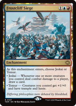 As this enchantment enters, choose Jeskai or Temur. • Jeskai — Whenever one or more creatures you control deal combat damage to a player, draw a card. • Temur — Creatures you control get +1/+0 and have trample and haste.