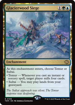 As this enchantment enters, choose Temur or Sultai. • Temur — Whenever you cast an instant or sorcery spell, target player mills four cards. • Sultai — You may play lands from your graveyard.