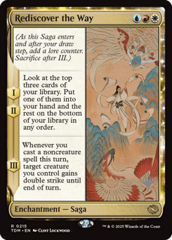 (As this Saga enters and after your draw step, add a lore counter. Sacrifice after III.) I, II — Look at the top three cards of your library. Put one of them into your hand and the rest on the bottom of your library in any order. III — Whenever you cast a noncreature spell this turn, target creature you control gains double strike until end of turn.