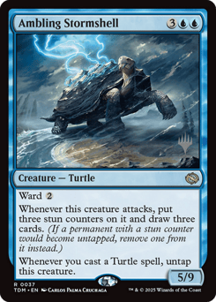 Ward {2} Whenever this creature attacks, put three stun counters on it and draw three cards. (If a permanent with a stun counter would become untapped, remove one from it instead.) Whenever you cast a Turtle spell, untap this creature.