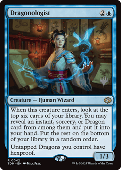 When this creature enters, look at the top six cards of your library. You may reveal an instant, sorcery, or Dragon card from among them and put it into your hand. Put the rest on the bottom of your library in a random order. Untapped Dragons you control have hexproof.