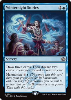 Draw three cards. Then discard two cards unless you discard a creature card. Harmonize {4}{U} (You may cast this card from your graveyard for its harmonize cost. You may tap a creature you control to reduce that cost by {X}, where X is its power. Then exile this spell.)