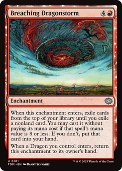 When this enchantment enters, exile cards from the top of your library until you exile a nonland card. You may cast it without paying its mana cost if that spell's mana value is 8 or less. If you don't, put that card into your hand. When a Dragon you control enters, return this enchantment to its owner's hand.