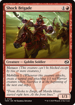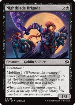Deathtouch Mobilize 1 (Whenever this creature attacks, create a tapped and attacking 1/1 red Warrior creature token. Sacrifice it at the beginning of the next end step.) When this creature enters, surveil 1. (Look at the top card of your library. You may put it into your graveyard.)