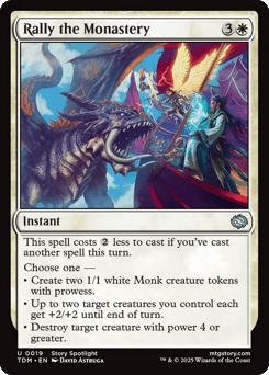 This spell costs {2} less to cast if you've cast another spell this turn. Choose one — • Create two 1/1 white Monk creature tokens with prowess. • Up to two target creatures you control each get +2/+2 until end of turn. • Destroy target creature with power 4 or greater.