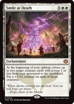 At the beginning of your upkeep, return up to two target creature cards with power 2 or less from your graveyard to the battlefield. Put a +1/+1 counter on each of those creatures.