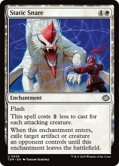 Flash This spell costs {1} less to cast for each attacking creature. When this enchantment enters, exile target artifact or creature an opponent controls until this enchantment leaves the battlefield.