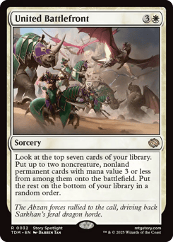 Look at the top seven cards of your library. Put up to two noncreature, nonland permanent cards with mana value 3 or less from among them onto the battlefield. Put the rest on the bottom of your library in a random order.
