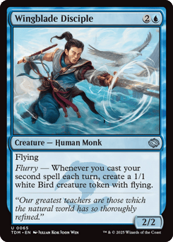 Flying Flurry — Whenever you cast your second spell each turn, create a 1/1 white Bird creature token with flying.