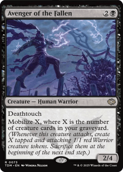 Deathtouch Mobilize X, where X is the number of creature cards in your graveyard. (Whenever this creature attacks, create X tapped and attacking 1/1 red Warrior creature tokens. Sacrifice them at the beginning of the next end step.)