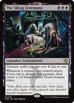 Creature spells you cast cost {2} less to cast. Whenever a creature you control enters, if you cast it, destroy that creature, then create a 2/2 black Zombie Druid creature token.