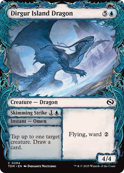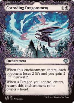 When this enchantment enters, each opponent loses 2 life and you gain 2 life. Surveil 2. (Look at the top two cards of your library, then put any number of them into your graveyard and the rest on top of your library in any order.) When a Dragon you control enters, return this enchantment to its owner's hand.