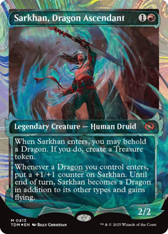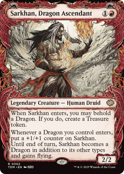 When Sarkhan enters, you may behold a Dragon. If you do, create a Treasure token. (To behold a Dragon, choose a Dragon you control or reveal a Dragon card from your hand.) Whenever a Dragon you control enters, put a +1/+1 counter on Sarkhan. Until end of turn, Sarkhan becomes a Dragon in addition to its other types and gains flying.