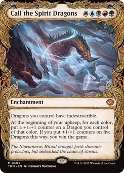 Dragons you control have indestructible. At the beginning of your upkeep, for each color, put a +1/+1 counter on a Dragon you control of that color. If you put +1/+1 counters on five Dragons this way, you win the game.