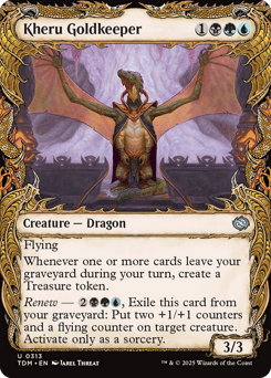 Flying Whenever one or more cards leave your graveyard during your turn, create a Treasure token. (It's an artifact with "{T}, Sacrifice this token: Add one mana of any color.") Renew — {2}{B}{G}{U}, Exile this card from your graveyard: Put two +1/+1 counters and a flying counter on target creature. Activate only as a sorcery.