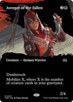 Deathtouch Mobilize X, where X is the number of creature cards in your graveyard. (Whenever this creature attacks, create X tapped and attacking 1/1 red Warrior creature tokens. Sacrifice them at the beginning of the next end step.)