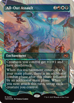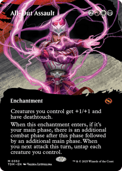 Creatures you control get +1/+1 and have deathtouch. When this enchantment enters, if it's your main phase, there is an additional combat phase after this phase followed by an additional main phase. When you next attack this turn, untap each creature you control.