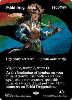Vigilance, trample, ward {1} At the beginning of combat on your turn, if you've cast both a creature spell and a noncreature spell this turn, draw a card and put two +1/+1 counters on Eshki Dragonclaw.