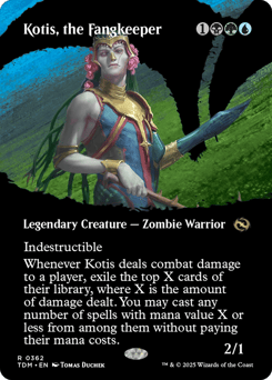 Indestructible Whenever Kotis deals combat damage to a player, exile the top X cards of their library, where X is the amount of damage dealt. You may cast any number of spells with mana value X or less from among them without paying their mana costs.