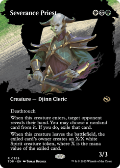 Deathtouch When this creature enters, target opponent reveals their hand. You may choose a nonland card from it. If you do, exile that card. When this creature leaves the battlefield, the exiled card's owner creates an X/X white Spirit creature token, where X is the mana value of the exiled card.