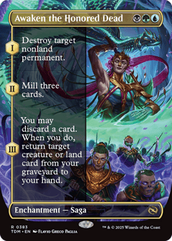 (As this Saga enters and after your draw step, add a lore counter. Sacrifice after III.) I — Destroy target nonland permanent. II — Mill three cards. III — You may discard a card. When you do, return target creature or land card from your graveyard to your hand.