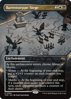 As this enchantment enters, choose Abzan or Mardu. • Abzan — At the beginning of your end step, put a +1/+1 counter on each creature you control. • Mardu — At the beginning of your end step, if a creature died under your control this turn, each opponent sacrifices a creature of their choice.