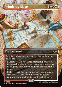 As this enchantment enters, choose Jeskai or Temur. • Jeskai — Whenever one or more creatures you control deal combat damage to a player, draw a card. • Temur — Creatures you control get +1/+0 and have trample and haste.