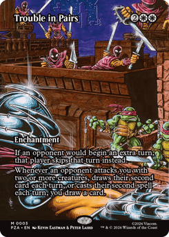 If an opponent would begin an extra turn, that player skips that turn instead. Whenever an opponent attacks you with two or more creatures, draws their second card each turn, or casts their second spell each turn, you draw a card.