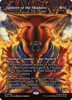 Whenever Ashcoat attacks or blocks, other Rats you control get +X/+X until end of turn, where X is the number of Rats you control. At the beginning of your end step, you may mill four cards. If you do, return up to two Rat creature cards from your graveyard to your hand. (To mill a card, put the top card of your library into your graveyard.)