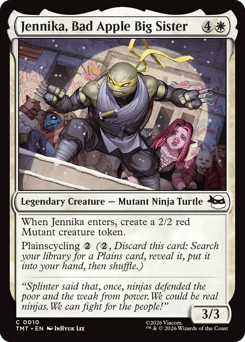 When Jennika enters, create a 2/2 red Mutant creature token. Plainscycling {2} ({2}, Discard this card: Search your library for a Plains card, reveal it, put it into your hand, then shuffle.)