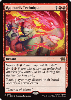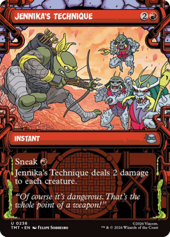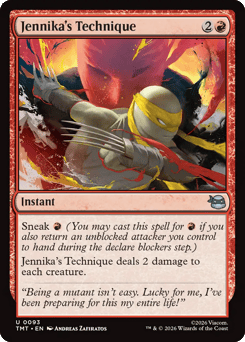 Sneak {R} (You may cast this spell for {R} if you also return an unblocked attacker you control to hand during the declare blockers step.) Jennika's Technique deals 2 damage to each creature.