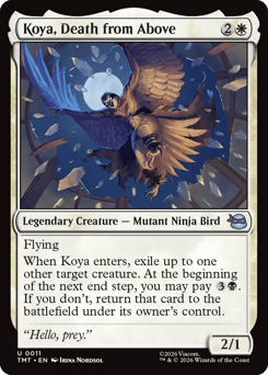 Flying When Koya enters, exile up to one other target creature. At the beginning of the next end step, you may pay {3}{B}. If you don't, return that card to the battlefield under its owner's control.