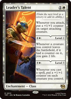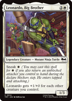 Sneak {W} (You may cast this spell for {W} if you also return an unblocked attacker you control to hand during the declare blockers step. He enters tapped and attacking.) Leonardo gets +1/+0 for each other creature you control.