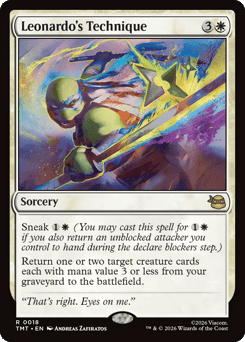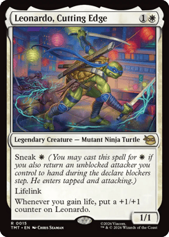 Sneak {W} (You may cast this spell for {W} if you also return an unblocked attacker you control to hand during the declare blockers step. He enters tapped and attacking.) Lifelink Whenever you gain life, put a +1/+1 counter on Leonardo.