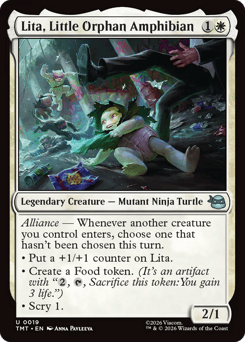 Alliance — Whenever another creature you control enters, choose one that hasn't been chosen this turn. • Put a +1/+1 counter on Lita. • Create a Food token. (It's an artifact with "{2}, {T}, Sacrifice this token: You gain 3 life.") • Scry 1.
