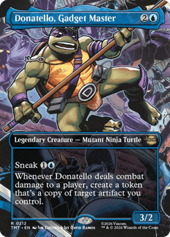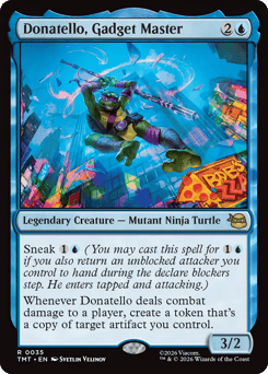 Sneak {1}{U} (You may cast this spell for {1}{U} if you also return an unblocked attacker you control to hand during the declare blockers step. He enters tapped and attacking.) Whenever Donatello deals combat damage to a player, create a token that's a copy of target artifact you control.