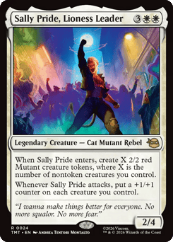 When Sally Pride enters, create X 2/2 red Mutant creature tokens, where X is the number of nontoken creatures you control. Whenever Sally Pride attacks, put a +1/+1 counter on each creature you control.